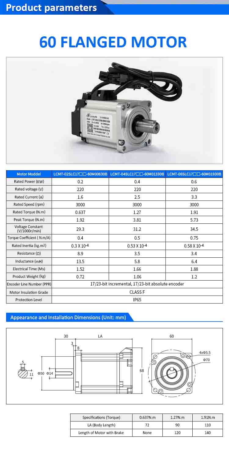 | Motor modell | LCMT-02SLC17-60M00630B | LCMT-04SLC17-60M01330B | LCMT-06SLC17-60M01930B |