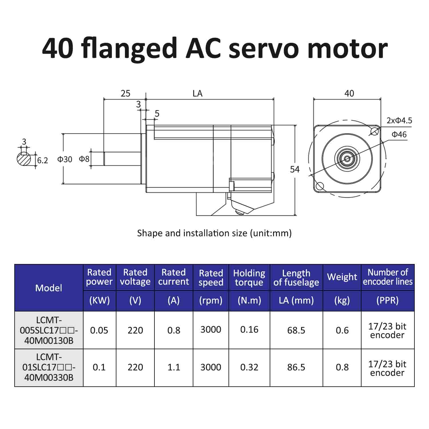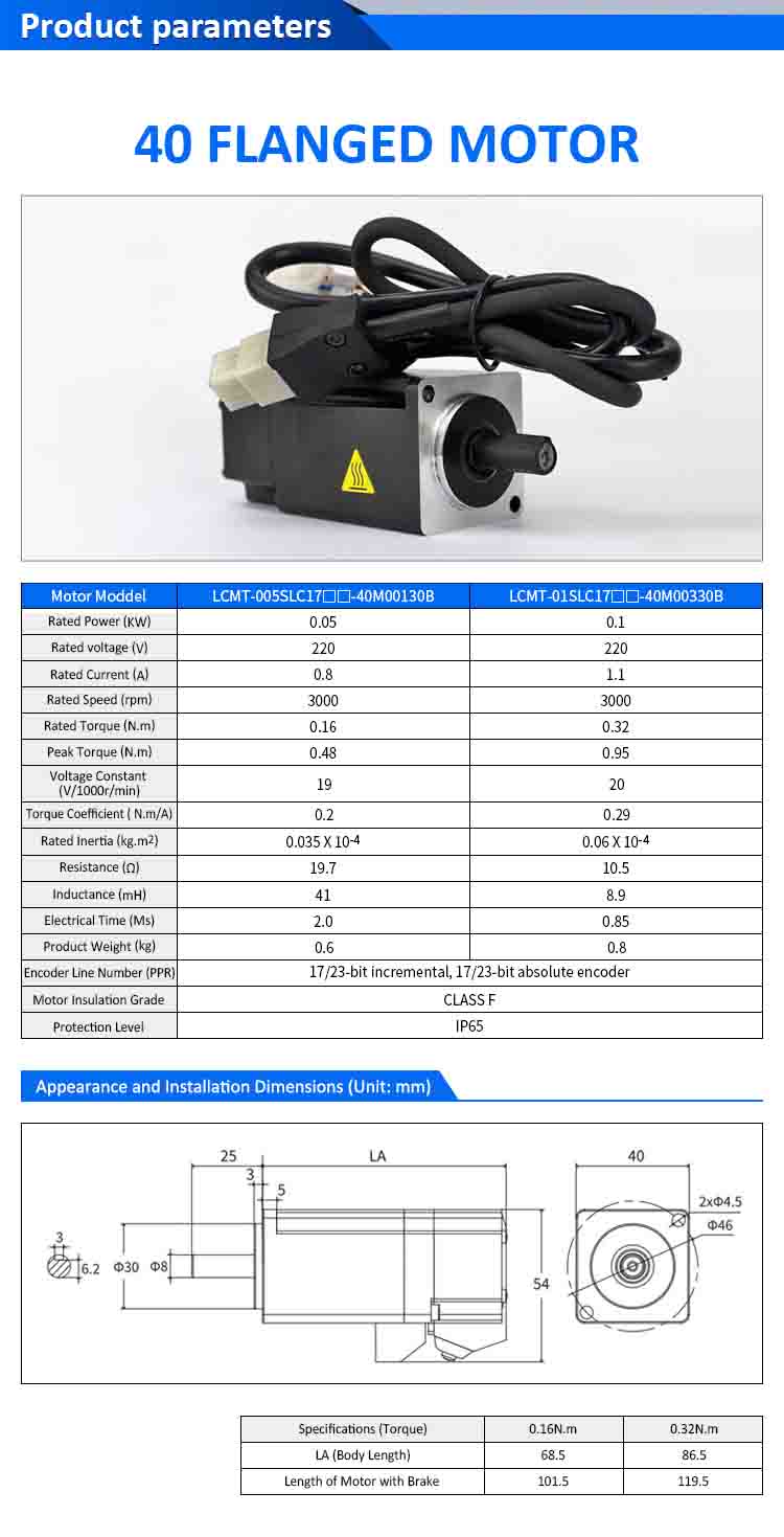 | Motor modell | LCMT-005SLC17-40M00130B | LCMT-01SLC17-40M00330B |