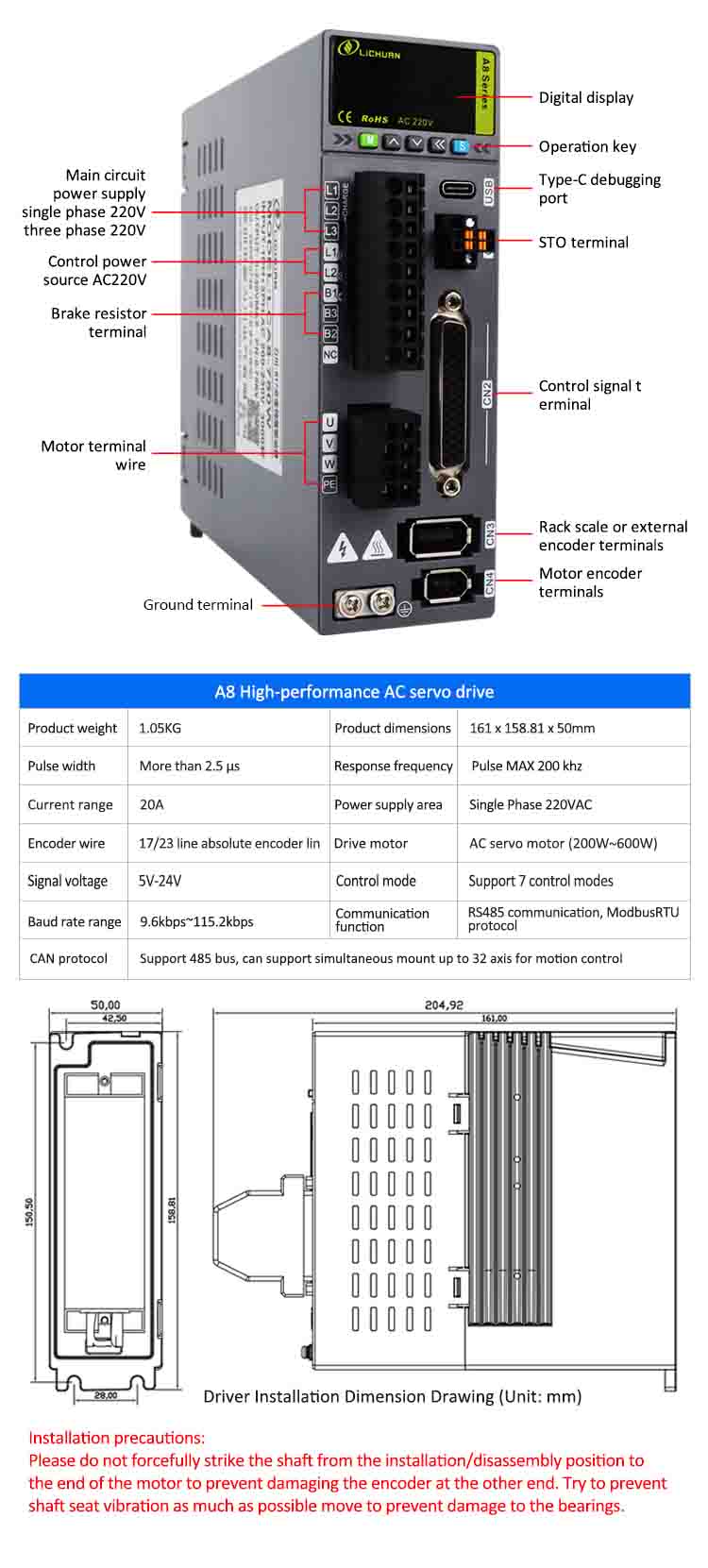 Az optimalizált kialakítás, a megnövelt nyomatékkimenet és a stabil 220 V-os váltóáramú tápstruktúra révén a Lichuan A8 rendszer kiemelkedő hatékonyságot és egyenletes mozgást biztosít mind az OEM-gyártók, mind a rendszerintegrátorok számára.